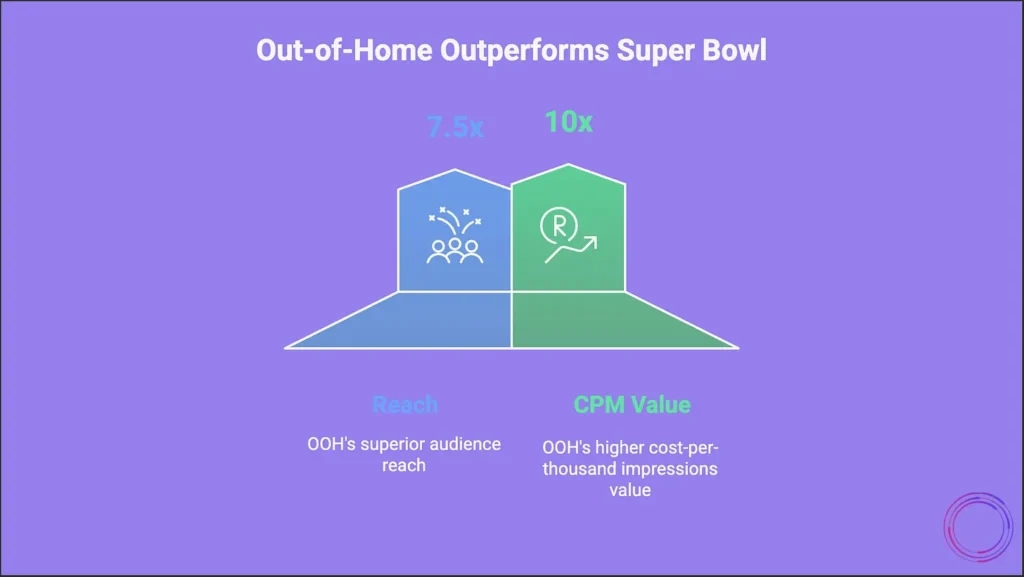 - OOH delivers 7.5X more reach and 10X more CPM value than a Super Bowl ad. (OAAA, “The Power of Out of Home,” 2025)