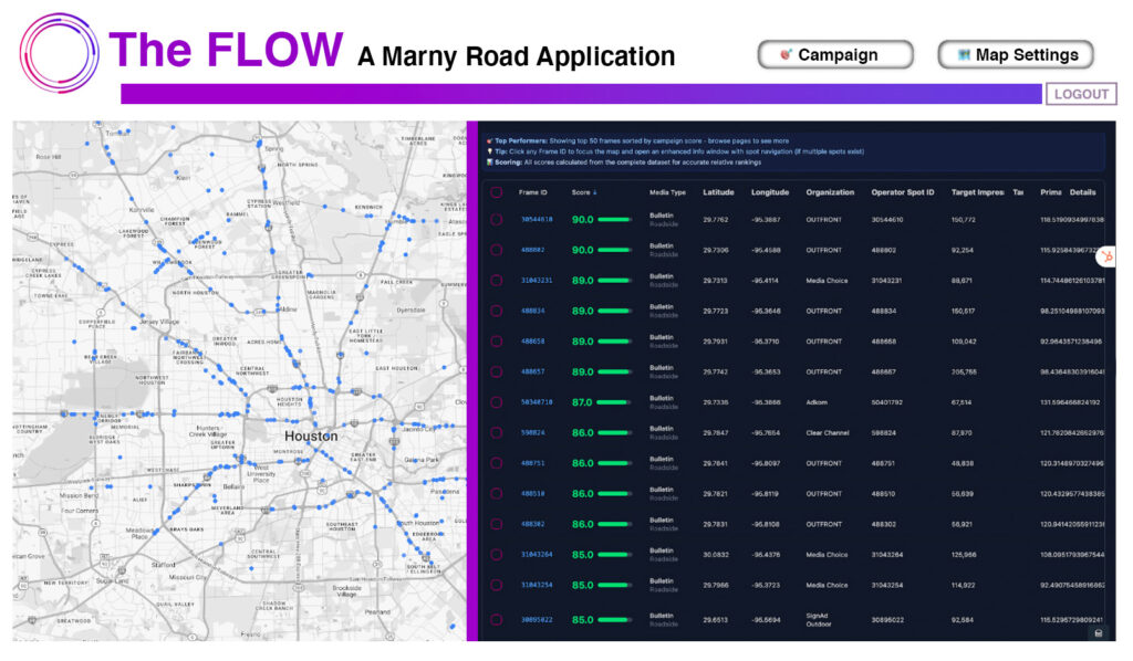 THE FLOW, developed by Marny Road, is an AI-powered platform that redefines OOH planning, optimization, and reporting. The platform allows Marny Road to rapidly set up a campaign including budget, target audience, and markets to be served, then the platform scores the assets per location including target impressions.