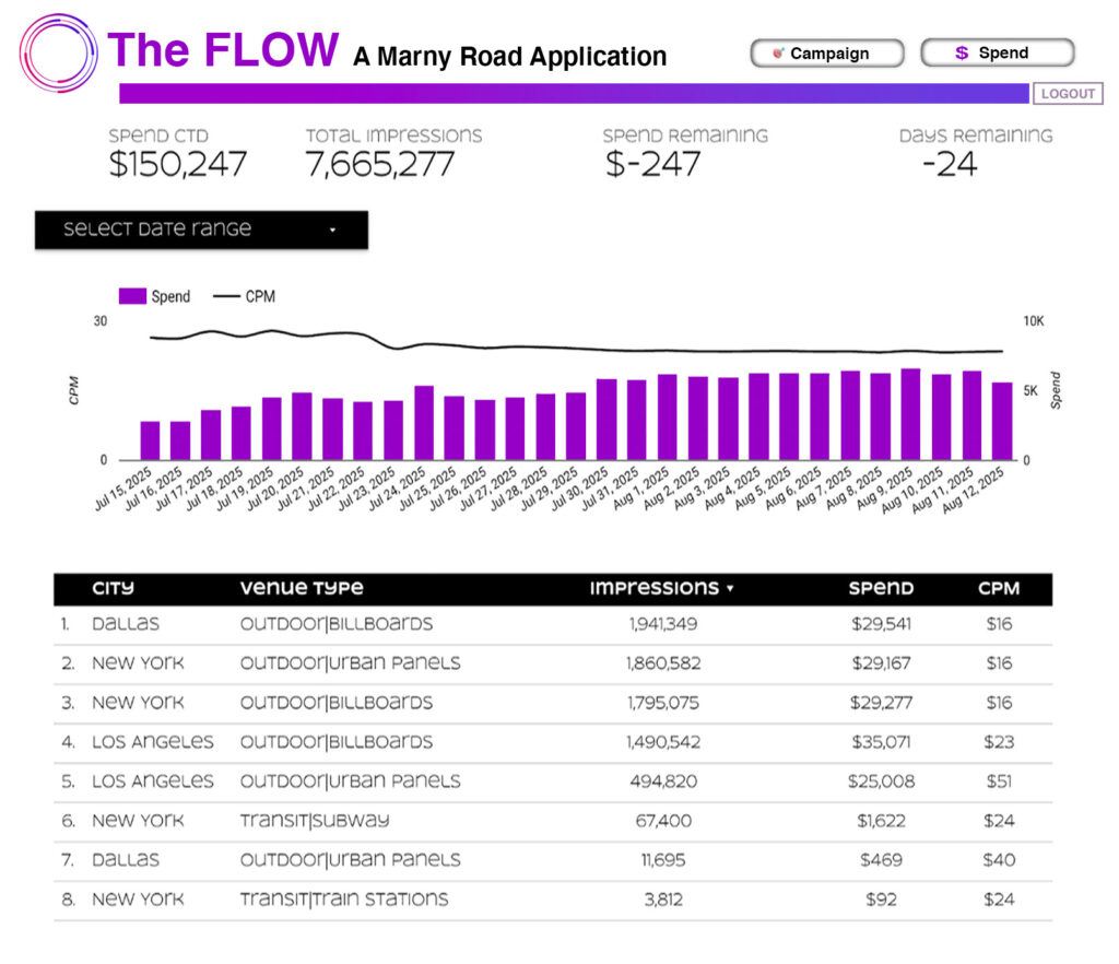 Built on API connections to OOH asset data, mobile device intelligence, DSPs, SSPs, and LLMs, combined with Marny Road’s curated data environment, THE FLOW scores OOH assets using granular, real-time local and contextual insights such as traffic patterns, cultural events, and neighborhood dynamics. This directs investment toward the opportunities most likely to drive outcomes, ensuring the right audiences are reached at the right cost while maximizing ROI. THE FLOW is not a self-service platform. It is designed to empower Marny Road and its partners with unmatched precision, speed, and intelligence.